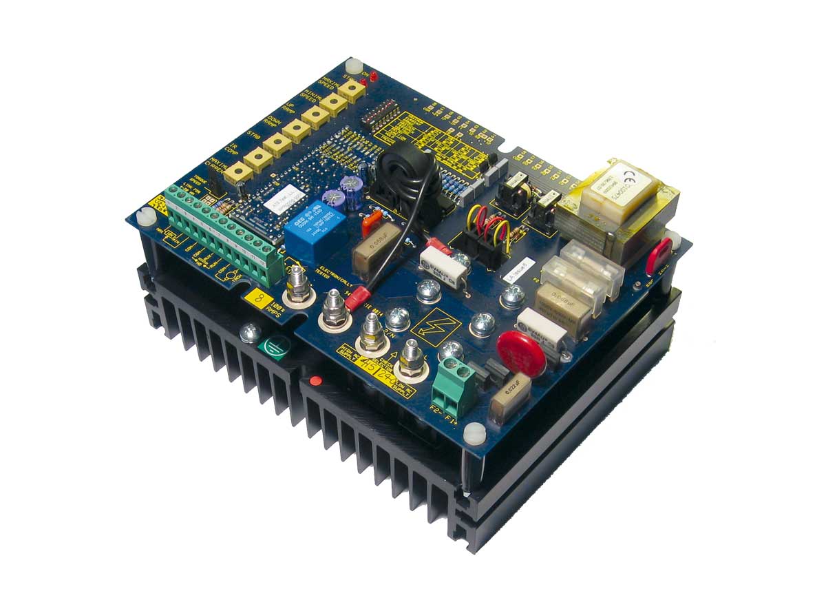 Small footprint speed controller for permanent magnet or shunt wound motors up to 4KW. Isolated. 1Q. Up to 16A output. 2ph 240 – 415V input, up to 320VDC output voltage.